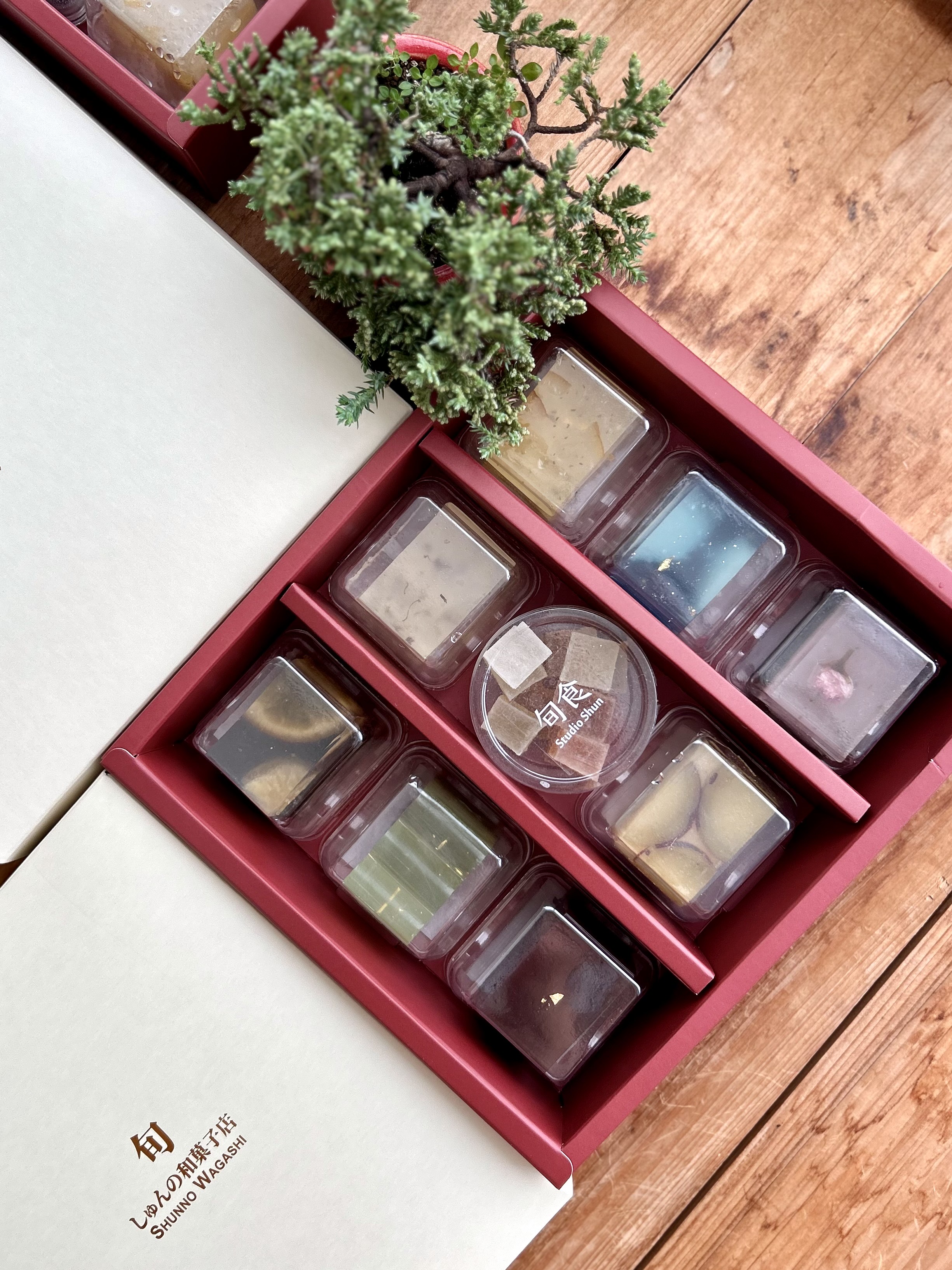商品內容物 : 星空羊羹、櫻花抹茶羊羹、地瓜羊羹、柑橘黑糖紅豆羊羹、木漏日、桂花酒釀錦玉各一份(3cm寬),每盒附上一款當季茶包或手沖咖啡包